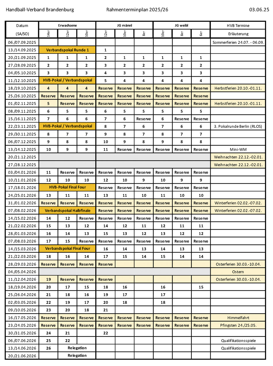 Der Handballverband Brandenburg hat den offiziellen Rahmenterminplan für die Saison 2025/26 veröffentlicht. Er enthält alle Spieltage, Pokalrunden sowie relevante Ferienzeiten und ist Grundlage für die Spielplanung in den jeweiligen Alters- und Leistungsklassen.